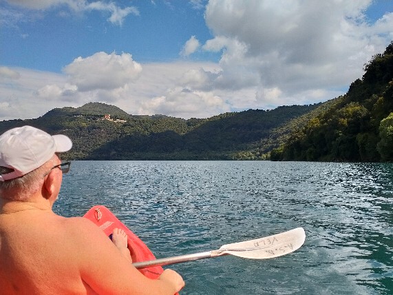 As we paddled along the lake's crystal-clear waters, the ancient hillsides that encircle Lake Albano stood as silent witnesses to our journey. The water was so clear that we could see the aquatic life below, darting to and fro in the depths.